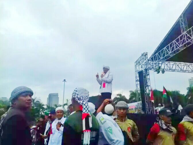 Cuaca gelap dan hujan rintik-rintik yang menyelimuti kawasan Monumen Nasional (Monas) tidak mengendorkan semangat umat Islam dalam melakukan Aksi Bela Palestina.