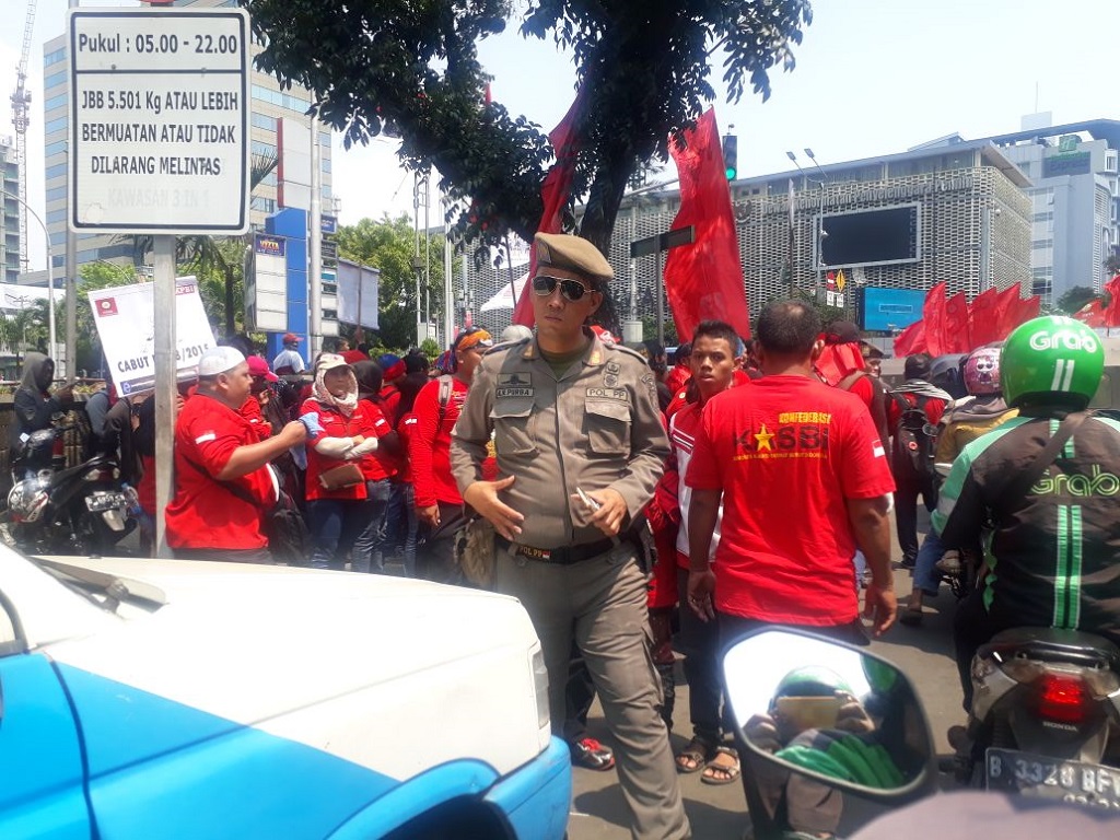 Aksi buruh berlangsung di tengah terik matahari, di Jakarta, (1/5/2018). Foto: Istimewa.