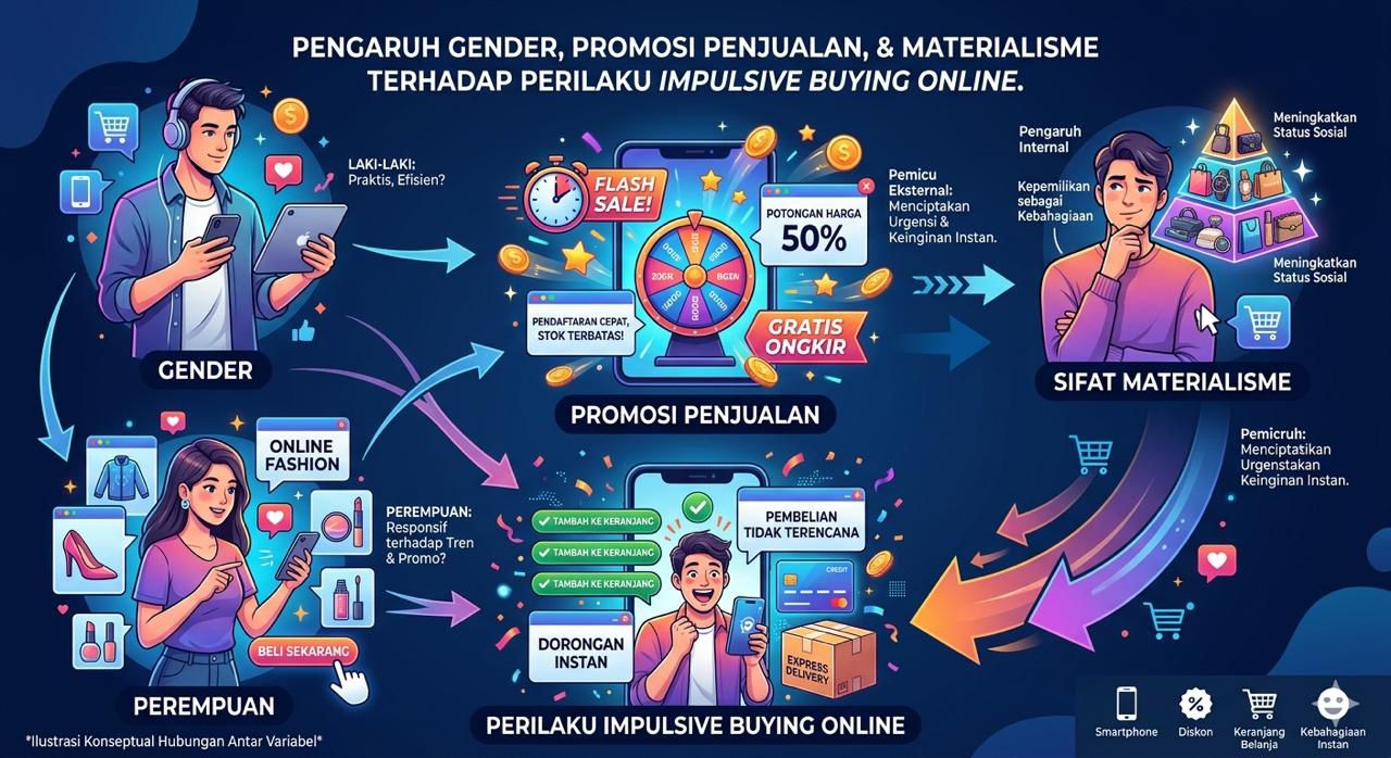 Kata Kunci: Gender, Promosi Penjualan, Materialisme, Perilaku Impulse Buying.