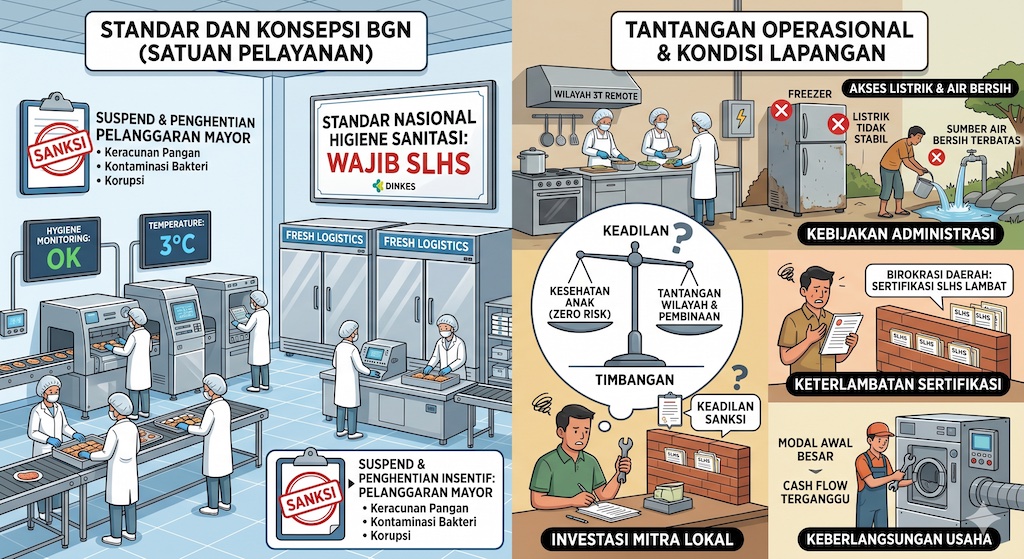 Kebijakan ini bukan sekadar gertakan. Di balik sanksi tersebut, terdapat doktrin finansial yang ketat: “No Service, No Pay”. Kepala BGN, Dadan Hindayana, menegaskan bahwa SPPG yang terkena suspend otomatis kehilangan haknya atas insentif harian sebesar Rp 6 juta.2 Langkah ini memicu perdebatan hangat: apakah ini langkah pendisiplinan yang tepat, atau justru sebuah kebijakan yang mengabaikan “darurat lapangan” di wilayah-wilayah sulit?