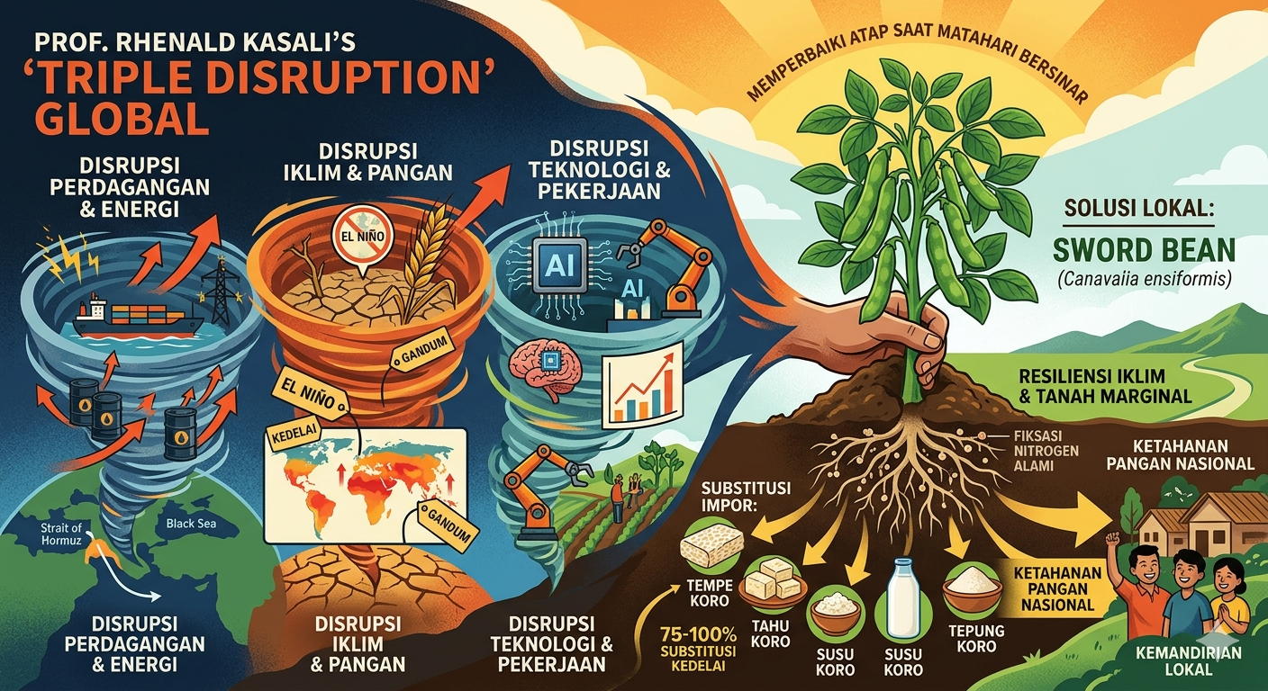 Titik lemah utama Indonesia saat ini terletak pada piring makan kita. Kita sangat bergantung pada kedelai impor untuk tempe dan tahu, serta gandum impor untuk mi dan roti. Saat rantai pasok global terganggu, stabilitas pangan nasional langsung goyah. “Waktu terbaik untuk memperbaiki atap adalah saat matahari masih bersinar,” ujar Kasali mengutip John F. Kennedy, mengingatkan kita agar tidak menunggu krisis menjadi bencana sebelum bertindak.